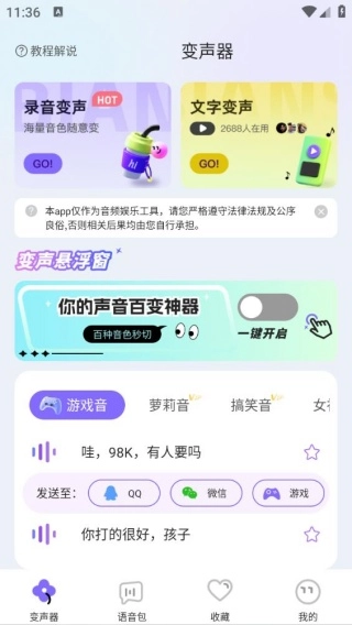 用户可以挑选热门语音合集、游戏音效、萝莉音色等语音包,让语音互动的场景更加丰富多样。