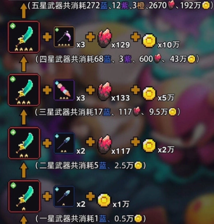 从1星升级到5星,总共需要消耗蓝色武器272个、紫色武器12个、橙色武器3个、血源矿2670个以及金币192万。