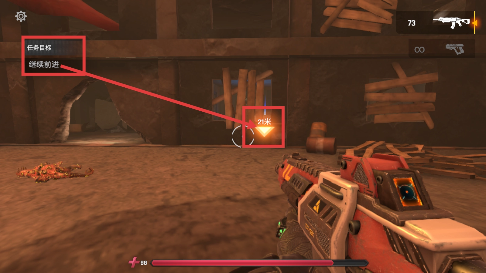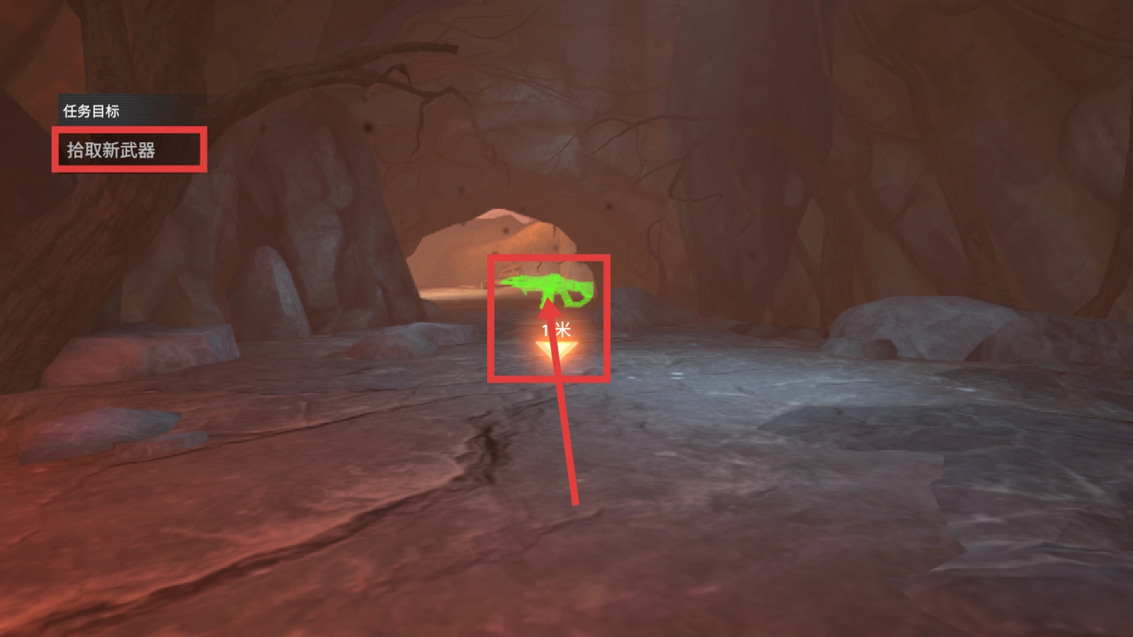 根据任务目标【拾取新武器】,靠近绿色武器图标进行拾取,以此获取新武器,为后续战斗打下基础。