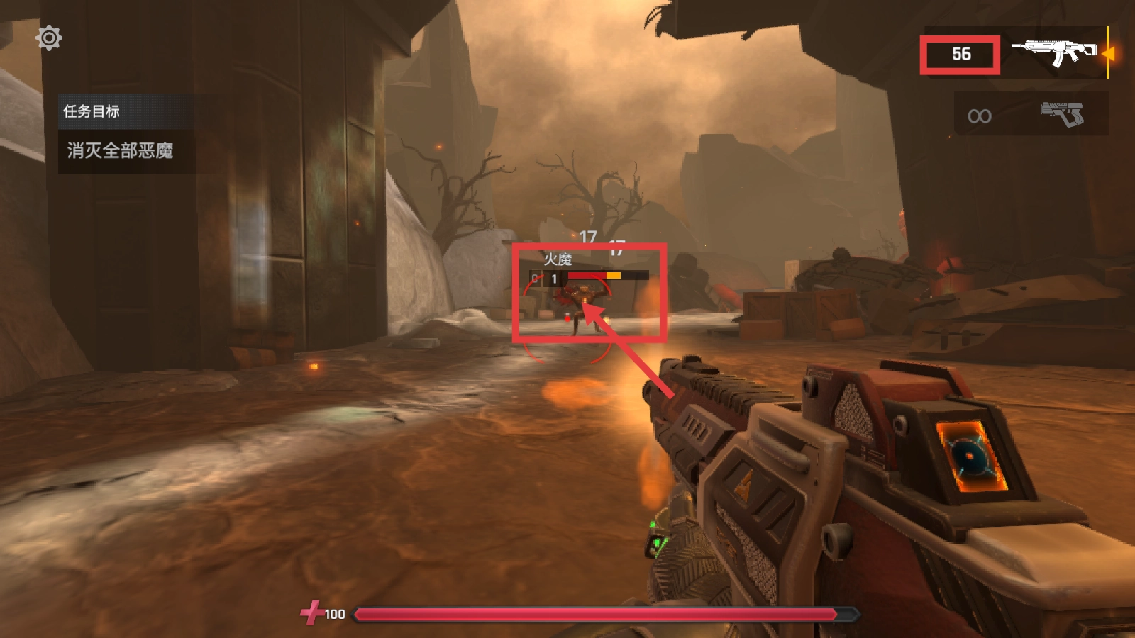 任务目标为【消灭所有恶魔】,请锁定【火魔】发起攻击,同时注意右上角显示的武器弹药数量为【56】,需通过合理射击来削减敌人的生命值。
