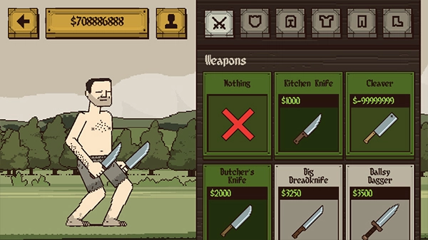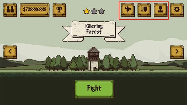 点击中间的“Fight”按钮就能开启游戏,界面上方从左往右排列的依次是训练场、武器和人物功能模块。