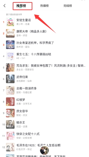 选择“推荐榜”栏目,浏览系统依据兴趣智能推荐的有声书作品。
