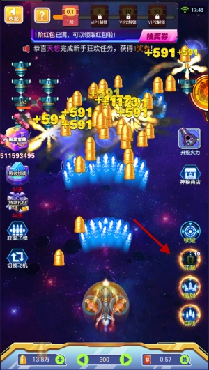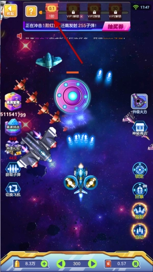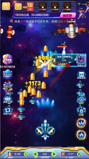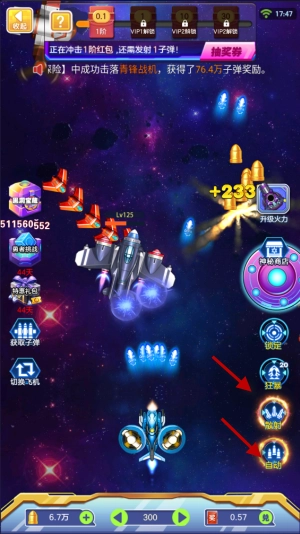 在游戏里,只要点击飞机就能发射子弹,也能点击下方的自动和散射按钮,这样就能挂机自动发射了。