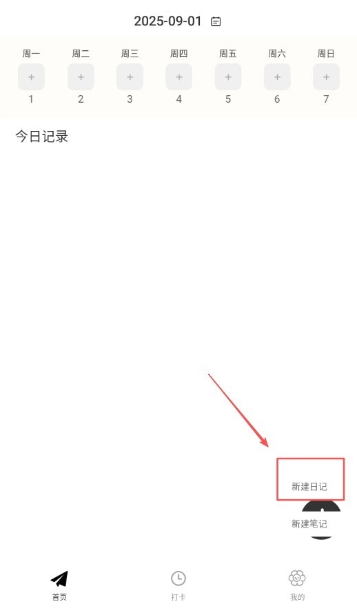 点击加号后,在弹出的功能选项中找到与新建日记相关的选项,点击此选项即可进入日记编辑界面。