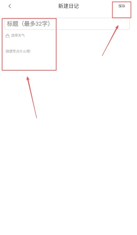 进入日记编辑界面后,先输入日记标题,再从选项里挑选对应的天气,接着填写日记内容,全部完成后点击保存。