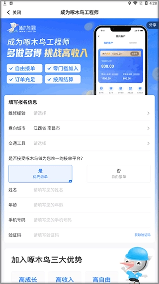 安装啄木鸟工程师软件,打开后在界面中找到并点击“申请入驻”入口,按照界面指引完成操作即可。