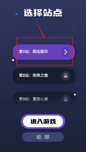 在“选择站点”界面,点击“第1站:砺志韶华”即可启动游戏。