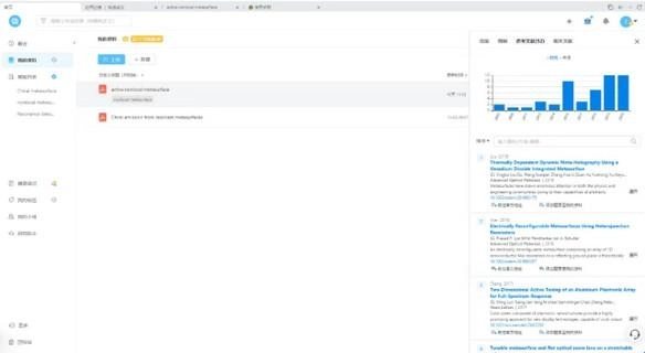 “边写边搜”界面设计简洁明了,功能模块涵盖最近、我的资料、智能列表、摘录笔记等。其中,“最近”板块整合了软件的学习教程与帮助文档;“我的资料”可存储用户上传的各类文件;“智能列表”支持对文献进行分类管理,还能直接上传文件、新建文件夹或笔记。上传文献时,系统会自动更新所需信息,包括提取文献图例、参考文献及相关文献,点击即可一键导入参考文献与相关文献。此外,软件多种文献搜索网站和AI智能助手,为学习提供全方位辅助。