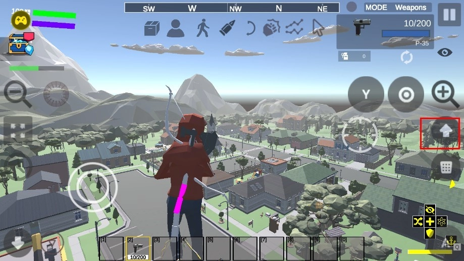 点击右侧的【向上箭头】按钮,就能实现原地起飞,借此占据高处位置,这样一来视野范围会得到扩大,方便对敌人进行伏击。