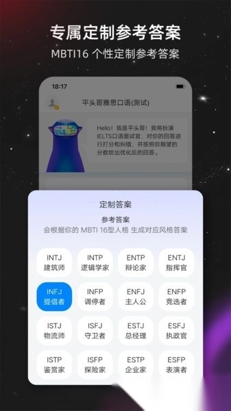 平台会根据用户的MBTI十六型人格特点,生成契合个人特质的参考回答。用户可以结合自己的语言习惯,挑选更自然的词汇和表达方式,打造出具有个人特色的答案;这不仅能够提高考试成绩,还能增强日常交流时的自信和流畅度。