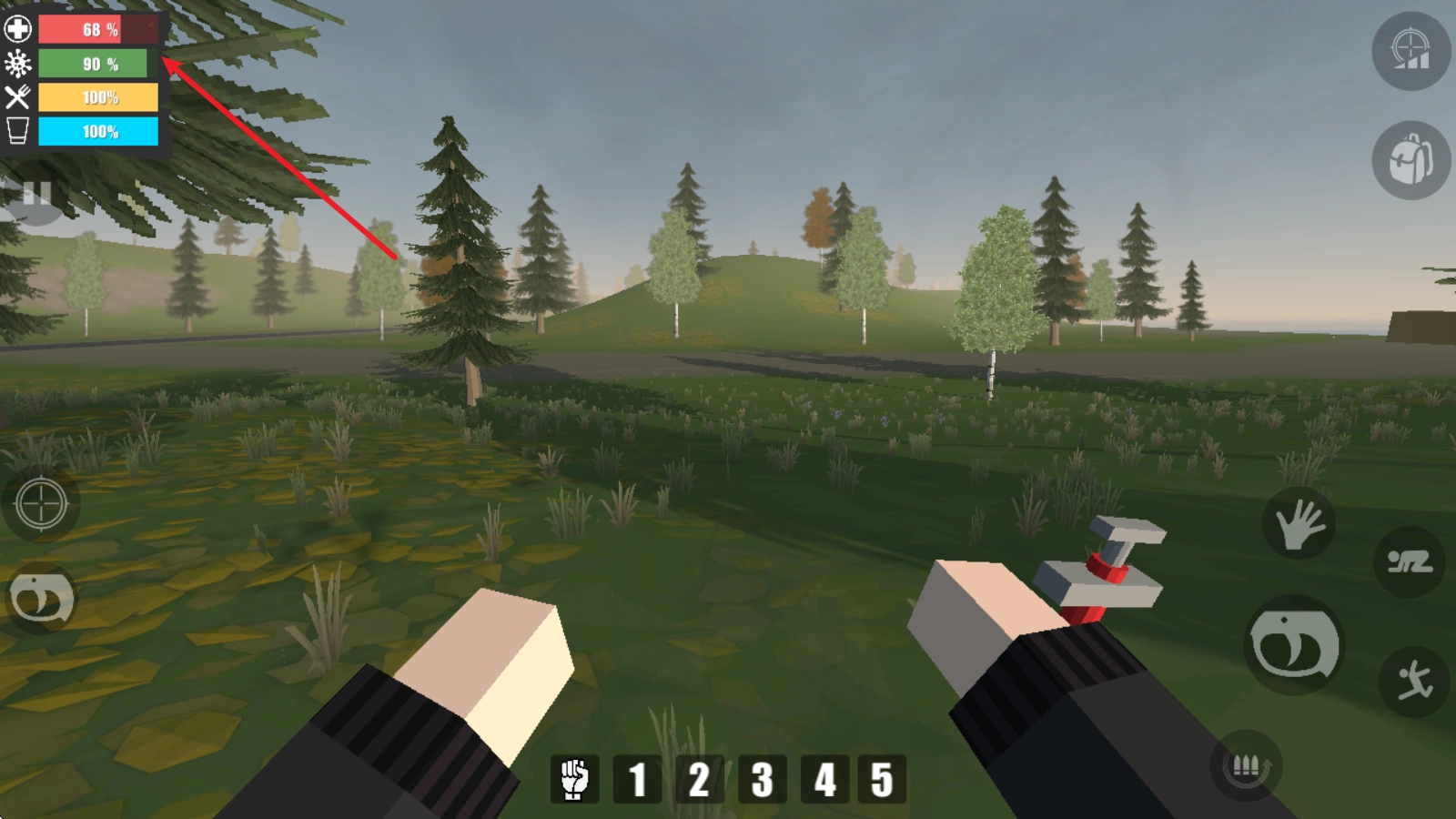 在画面的左上角,你可以清晰地看到自己的各项状态数据,包括当前的血量、饥饿值以及口渴度等信息。