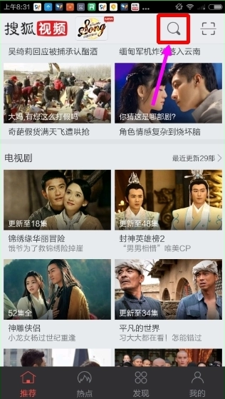 打开搜狐视频,点击首页右上角“放大镜”图标;