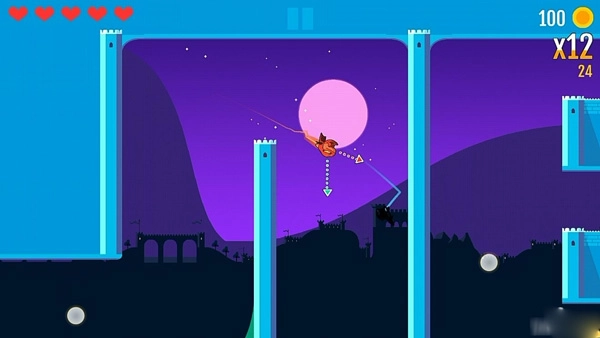这个状态还有个特点,就是能同时调整两个方向,也能按住一侧屏幕时操作另一侧屏幕,就像上面图里展示的那样;大家能看到我是用两根手指按住屏幕的(屏幕上有两个白点)。这时候要是我松开左边屏幕但不放开右边屏幕,角色就会保持慢镜头状态沿着调整好的方向飞行。而且只要我不松开右边屏幕,还能重复进行这个操作。
