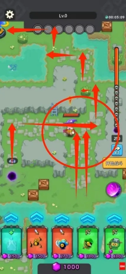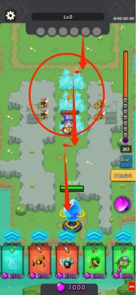 留意敌方的攻击次序,只要路径没有被阻挡,小怪就不会主动攻击(它们会优先攻击水晶和玩家,要确保英雄的血量始终高于50%)