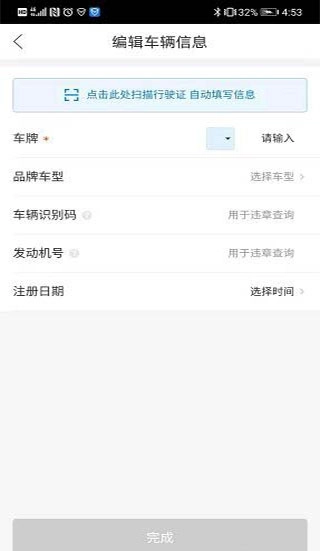 点击“去添加”进入车辆信息编辑界面,该界面支持通过扫描车辆行驶证来自动添加信息。