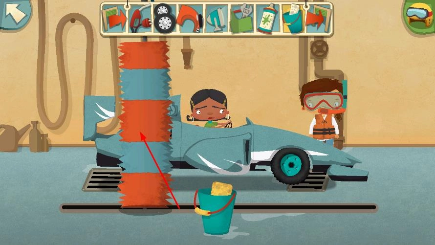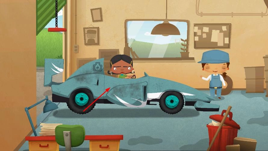 1. 进入汽车修理厂的场景,当面对那辆等待修理的赛车时,依照提示启动维修流程。