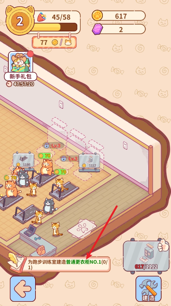进入游戏后,我们首先点击右下角的建造按钮,通过这个入口就能着手建设健身房的各类房间了。