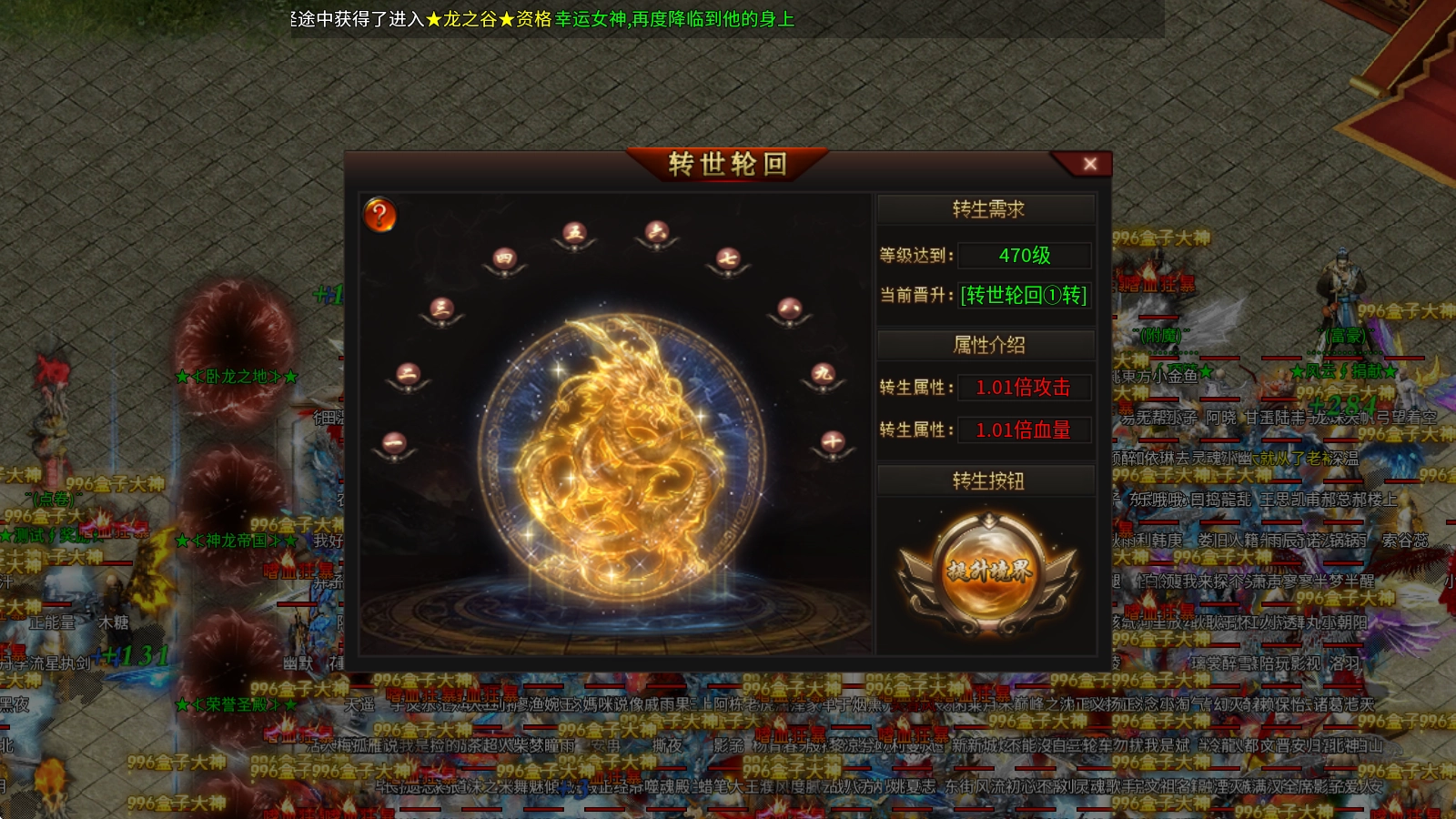 转世轮回:等级到达470级之后即可进行转生,提升攻击和血量属性,并且属性将永久继承到人物身上。