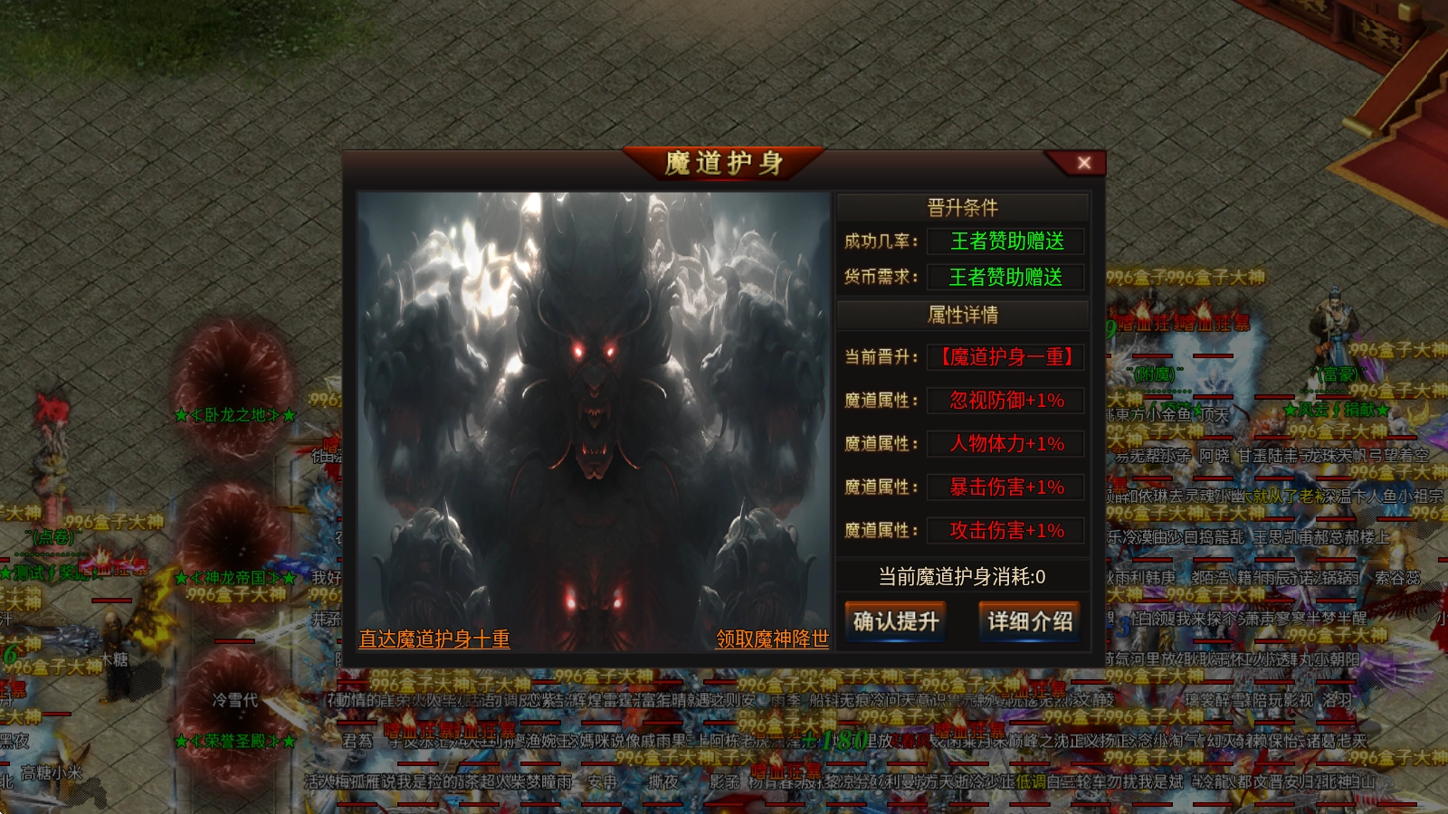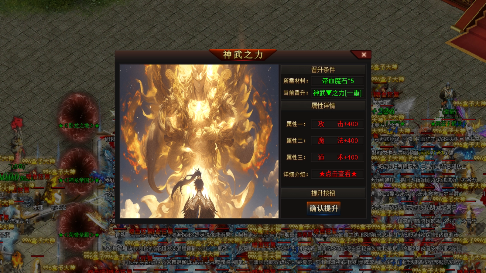 神武之力:消耗帝血魔石来提升,可提供高额的攻魔道属性加成。当提升至五重时,有几率触发整体伤害提高百分之五的效果;提升到十重后,则有几率触发整体伤害提高百分之十的效果。