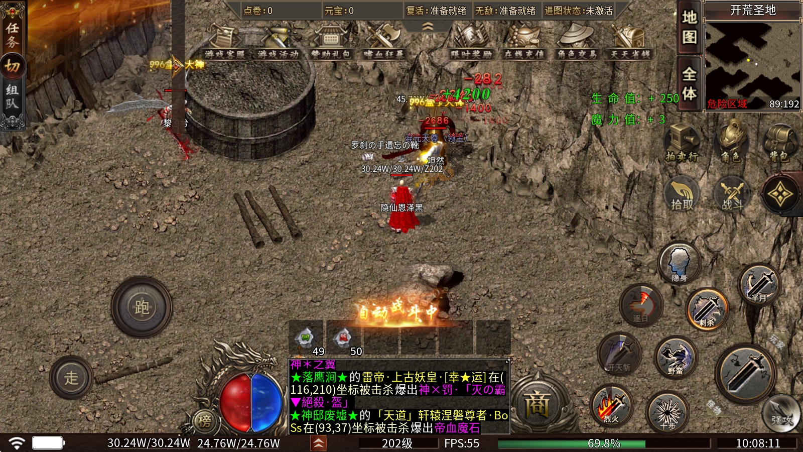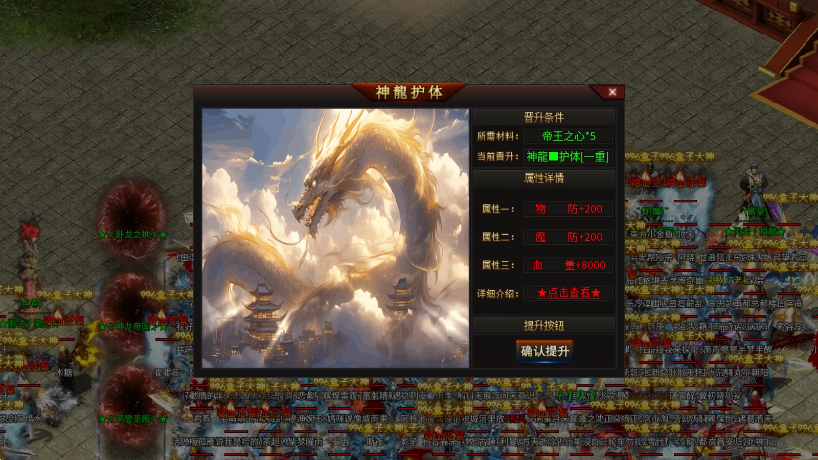 神龙护体:消耗帝王之心即可提升等级,每提升一重都能增加物防、魔防与血量,达到第五重和第十重时,还能额外获得减少伤害的BUFF效果。