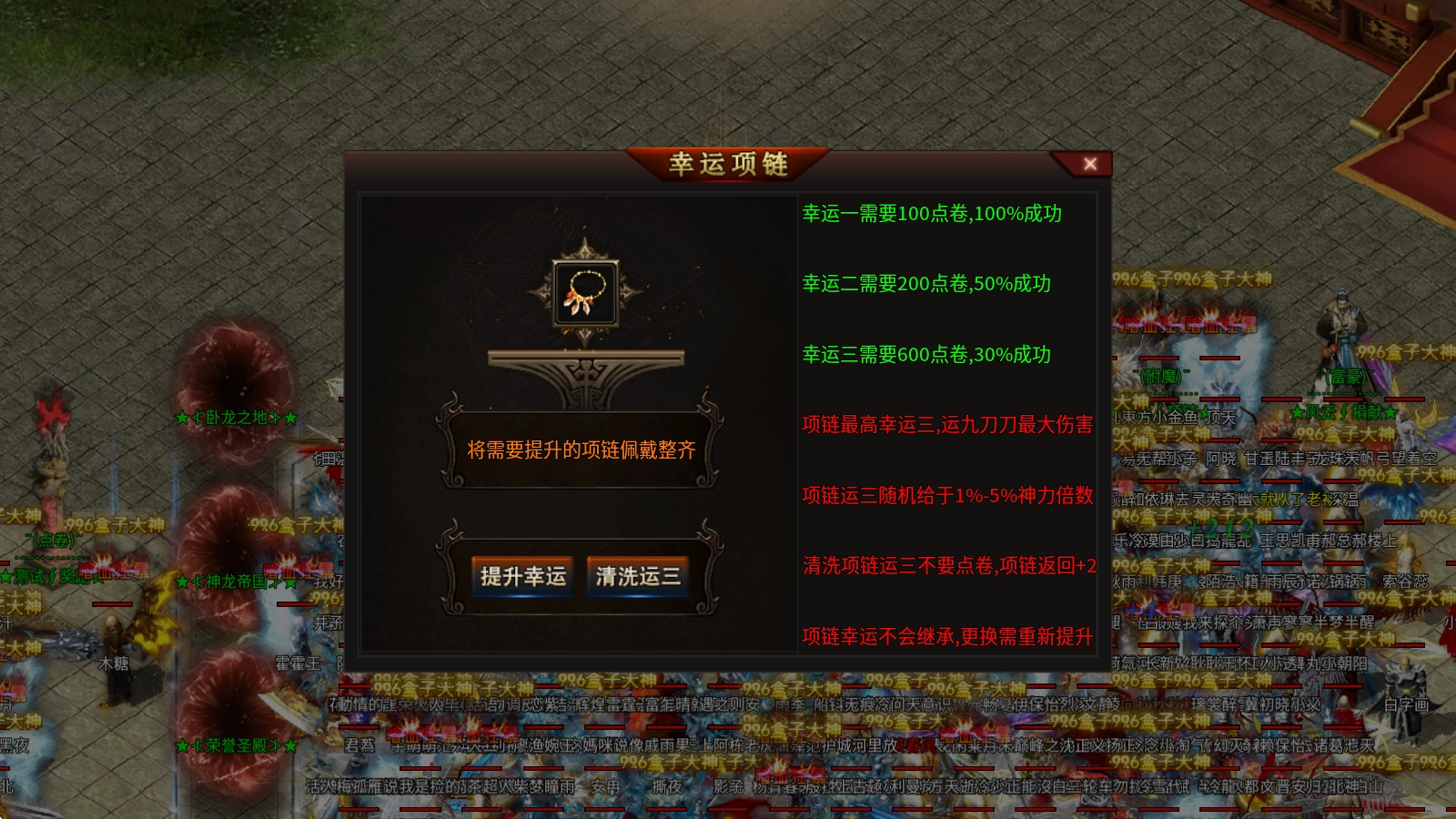 幸运项链:项链最高幸运三,运九刀刀最大伤害。项链运三随机给于1%-5%神力倍数,清洗项链运三不要点卷,项链返回+2,项链幸运不会继承,更换需重新提升。
