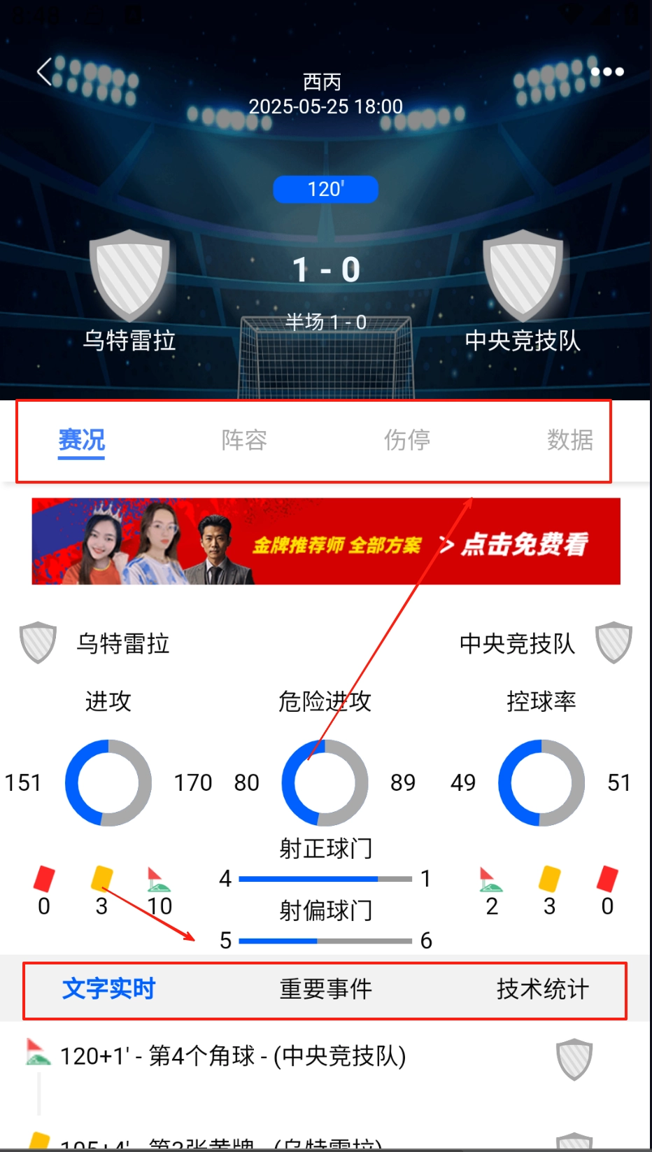 进入数据统计板块,查看实时更新的球队控球率、射门次数等18项核心参数。