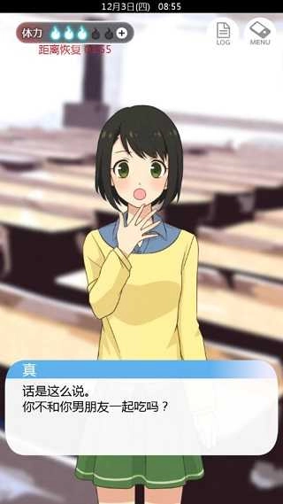 接着走进教室,第一章的女主角美都里和男主角互相问候了几句,不过这些对话我们暂且可以跳过。我们先把里面一个重要信息记下来:中午12点约好一起吃饭。