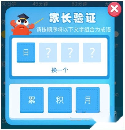 第二步:进入设置页面之前,需要先通过一个简单的家长成语验证环节。