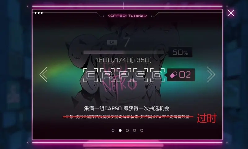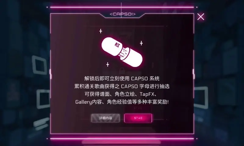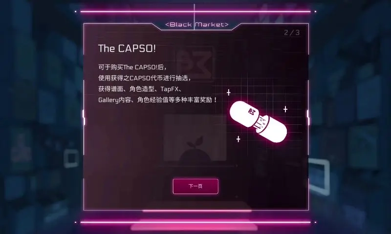 首次进入商城时,系统会自动弹出说明页面,依次对三个核心内容进行介绍:一是名为“Black Market(黑市)”的氪金曲包,二是发音与“capsule(胶囊)”相同的胶囊抽奖“CAPSO!”,三是“CAPSO SHOP(胶囊商店)”的胶囊购物功能。