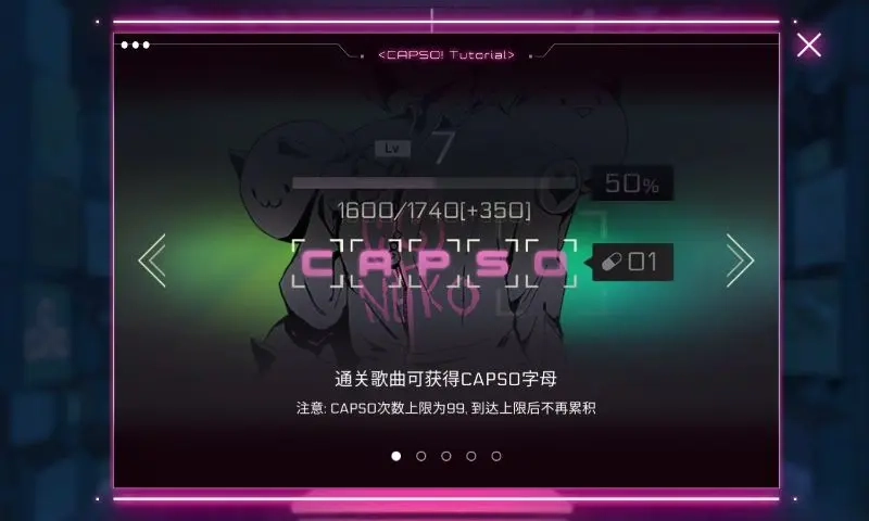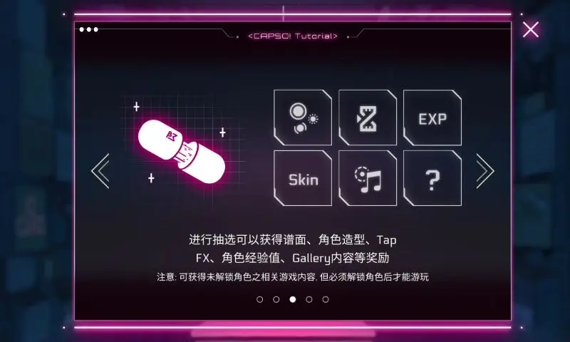 首次进入游戏时,这段教程是强制呈现且无法跳过的。它阐述了剧情与新曲之间的关联,结合通过升级来解锁剧情的设定,隐晦地揭示了游戏的推进逻辑:阅读剧情后解锁新曲,通过打歌提升等级,等级提升又能解锁新的剧情,如此循环往复直至达到满级。