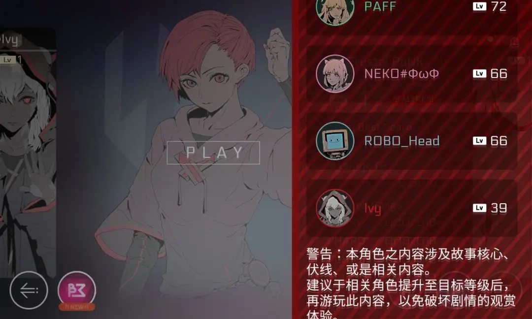 当未达到推荐等级时,首次点击Crystal PuNK的角色卡片,屏幕右侧会自动弹出红色的剧透警告;再次点击屏幕关闭警告后,它不会再自动弹出。而一旦达到推荐等级,该警告就会消失。