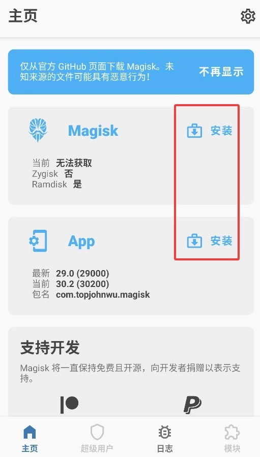 在主页的功能区域,你可以点击操作来安装Magisk主程序以及与之相关的功能模块。