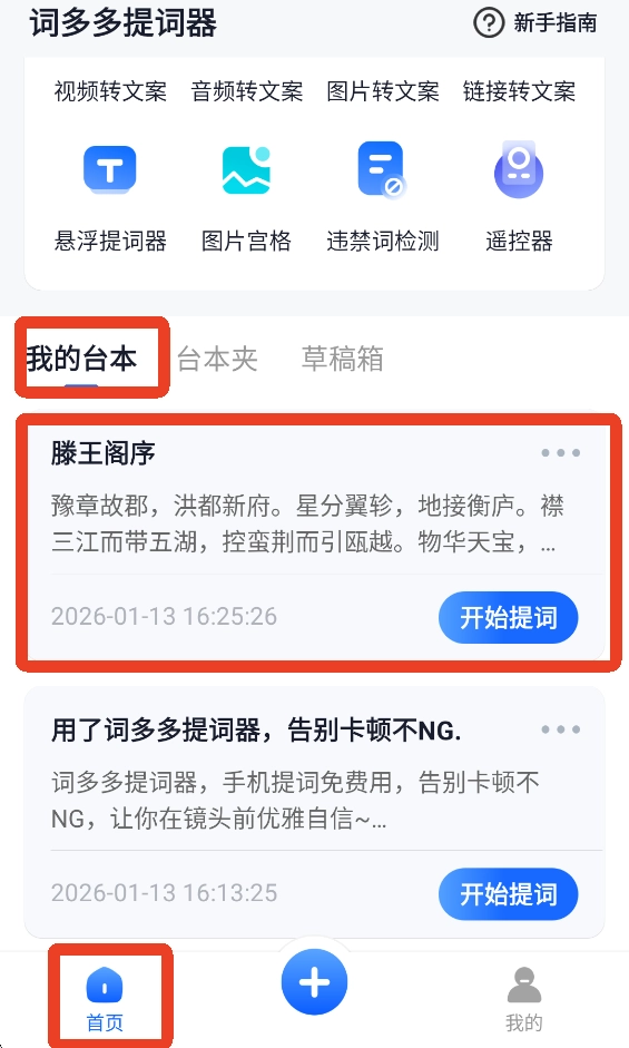 完成操作后点击“保存台本”按钮,回到首页就能看到已保存的台本内容。