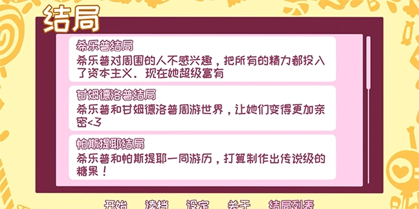 《希乐普与终极糖果》是一款充满趣味的角色扮演类Galgame,游戏内不仅有丰富可爱的角色形象,还有各式各样的糖果娘等待玩家收集养成。玩家将化身实力强大的魔法糖果炼金师,凭借精湛的技艺制作出多种美味糖果,进而解锁更多独特角色——超多软萌的非人娘角色会根据玩家的选择所积累的好感度,为你开启多样的冒险玩法。你需要通过不同的选项提升角色好感,解锁全新的故事篇章;丰富的经营元素搭配经典的Galgame体验,让你沉浸式代入游戏世界,亲手研发出心中理想的终极糖果娘。更有多达10种不同结局,藏着各种有趣设定等待探索,快来自由解锁属于你的专属剧情吧!
