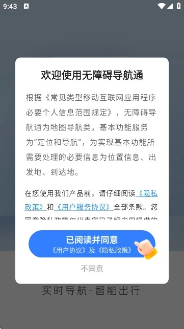 1:打开无障碍导航通,仔细阅读《用户协议》和《隐私政策》,点击“已阅读并同意”按钮进入。