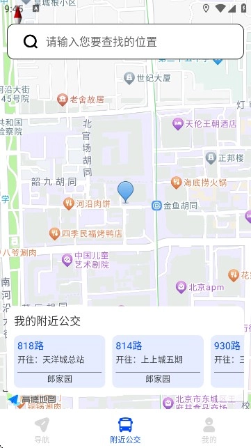 9:切换至“附近公交”界面,能够查看周边的公交路线(例如818路、814路等)以及对应的停靠站点,进而规划公共交通的出行方案。