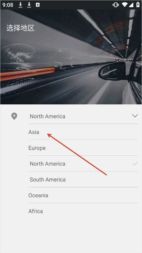在手机上安装好软件后,就能打开进入软件界面。因为这是国际版本,所以用户首先需要设置地区,操作时点击下图中红色箭头所指的位置即可。