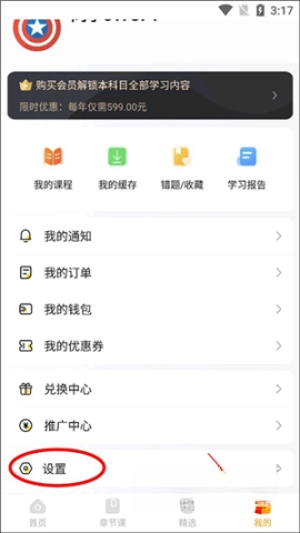 进入注会亿题库后,直接点击“我的”进入个人界面,找到并查看设置选项。