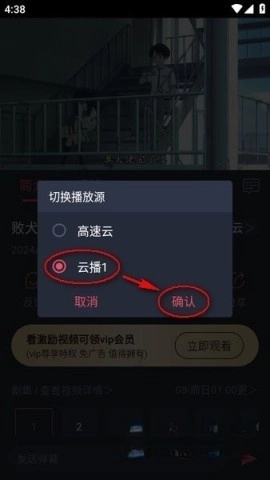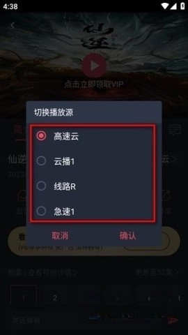 之后会弹出“切换播放源”的窗口,选择其他播放源并点击“确认”,即可解决播放问题。