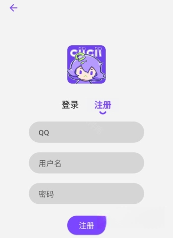 切换至“注册”页面,填写QQ号与用户名,设置好密码后点击“注册”按钮即可。