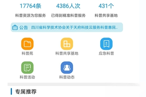 打开天府科技云App,点击首页“科普共享基地”;