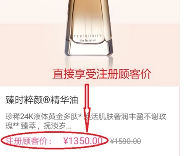 第一点:注册成为顾客就能直接享受注册顾客专属价格。拿这款精华油举例,直接购买的价格是1580元,而注册成顾客后购买只需1350元,一下子就省了230元,这些钱足够买好几个粉刷了。
