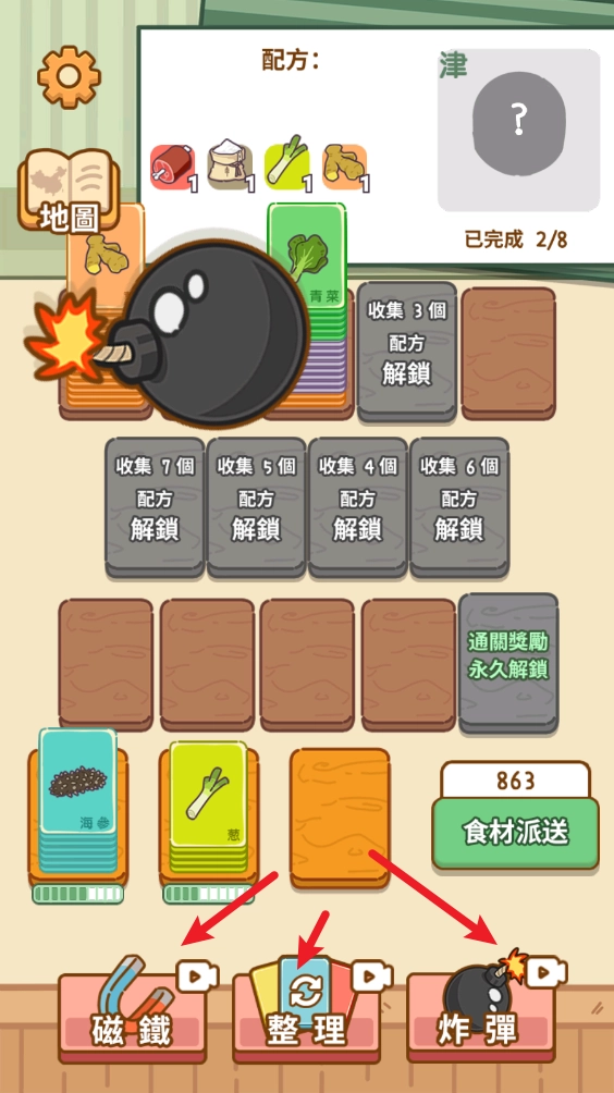 当食材收集到10个时,把它们放到下方的案板上,就能合成出对应的食材了。