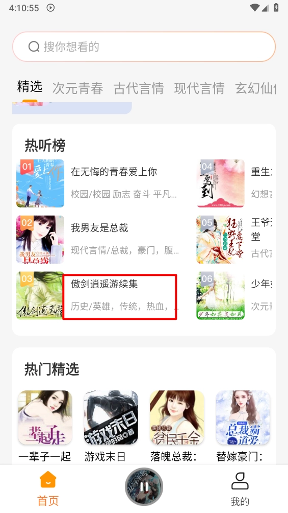西果免费听书涵盖次元青春、古代言情、玄幻修仙等多种小说题材,平台内所有内容均可免费畅听,每日持续更新最新资源,用户还能浏览热门听书榜单,所有章节无任何收听限制,并且支持一键搜索、定时播放、倍数听书等实用功能。
