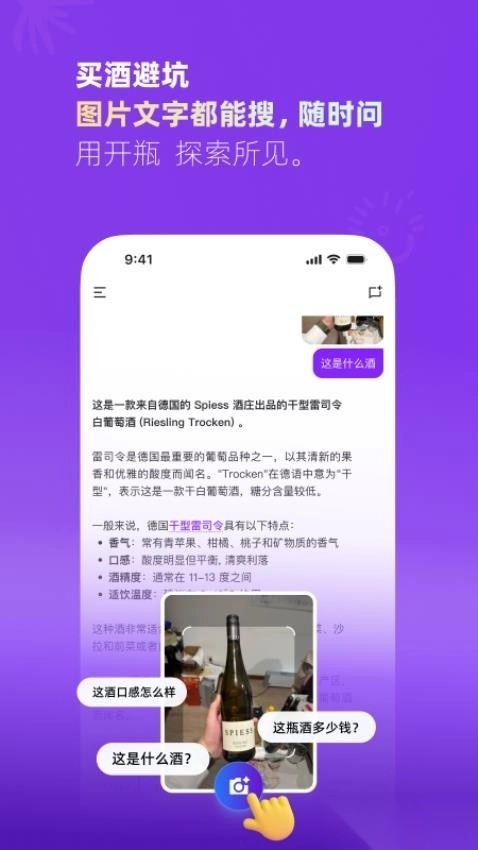 借助AI对话功能查询各类酒品的详细信息,掌握更多酒类相关常识,帮助用户在购买酒水时避开常见的陷阱。