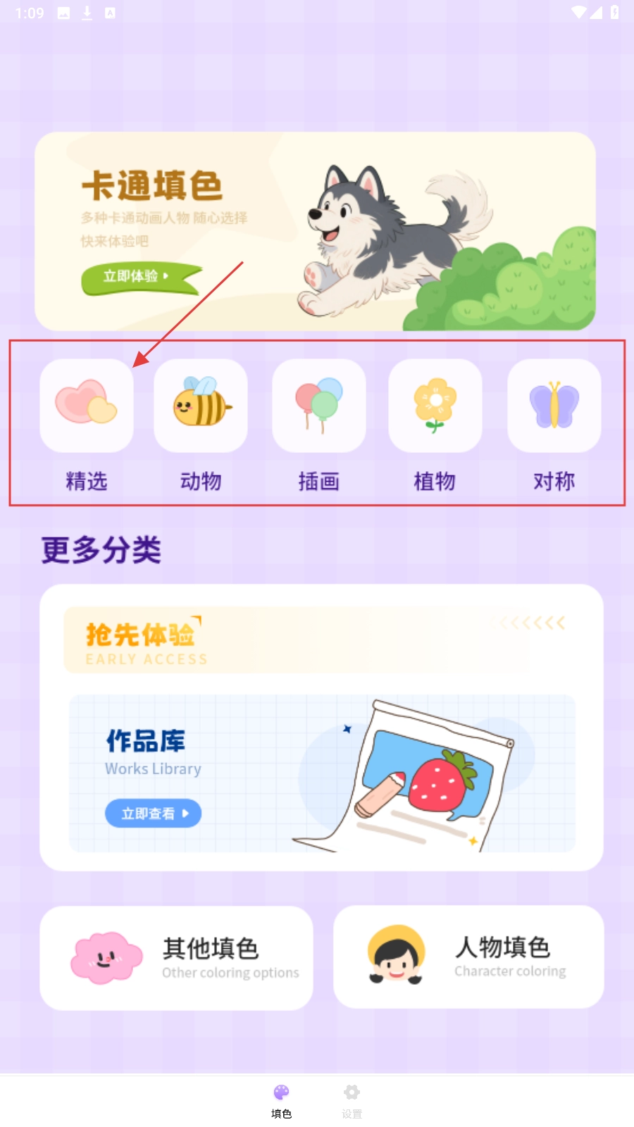 打开应用后,点击【精选】分类,进入主题填色区域,即可开启卡通填色体验。