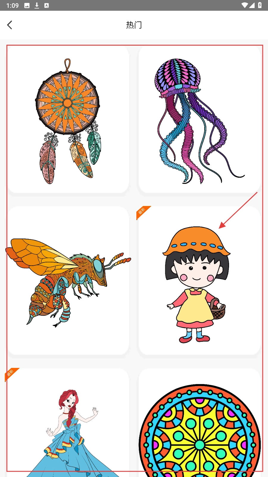 在【热门】图案页面,挑选自己喜欢的卡通形象,比如戴帽女孩,然后进入填色界面。