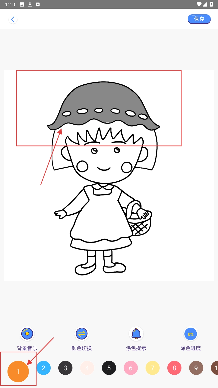 选择填色工具,点击颜色【1】,在女孩的帽子区域进行上色操作,填充基础色。