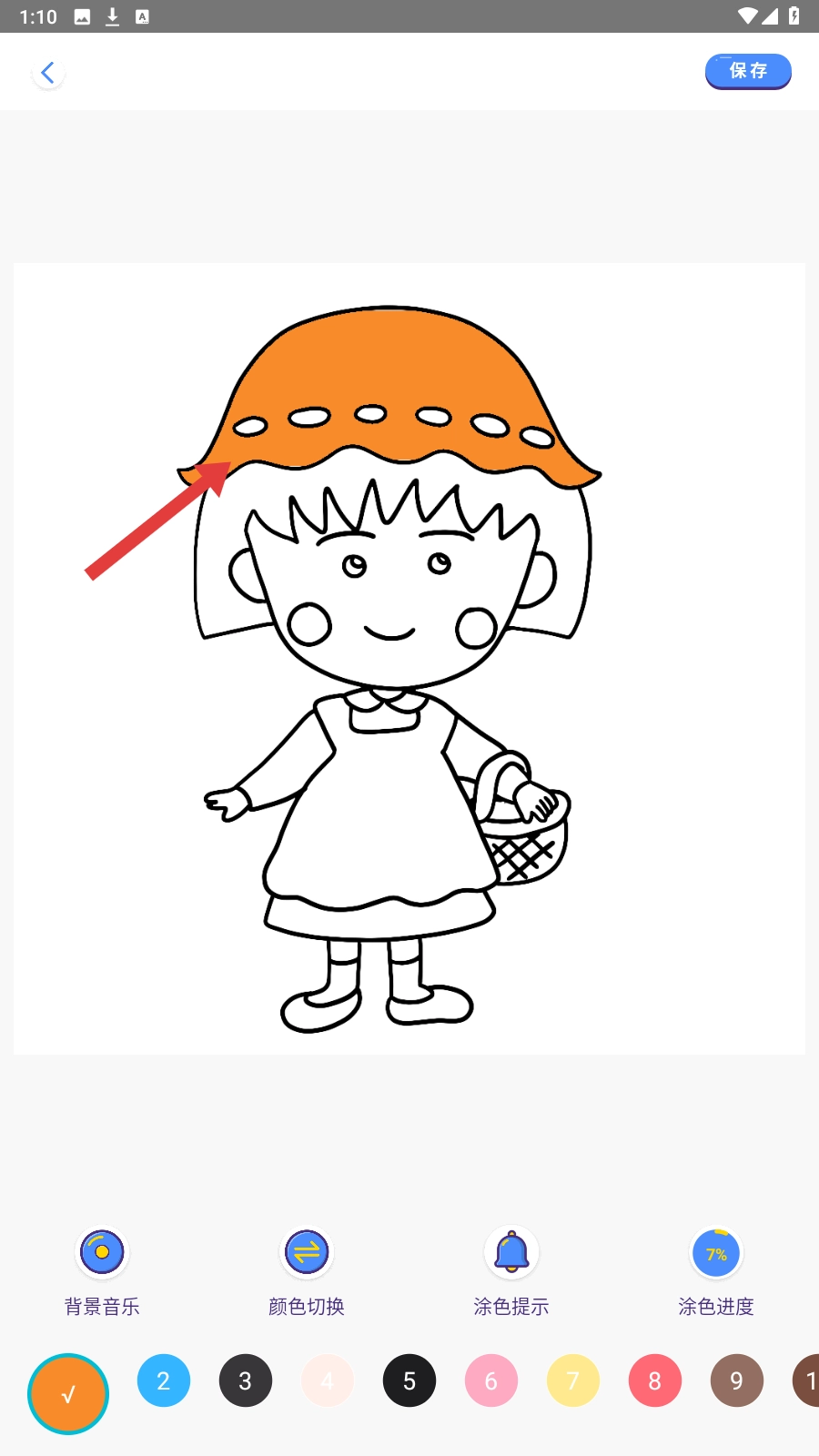 用选定的颜色完成帽子的填色,若需更换颜色可继续操作,全部填好后点击【保存】按钮即可留存作品。
