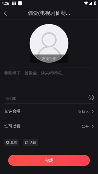 接下来可以填写要发布的文案和背景图片,还能设置合唱是否私密发布,完成这些设置后点击“完成”按钮,就能成功发布啦!